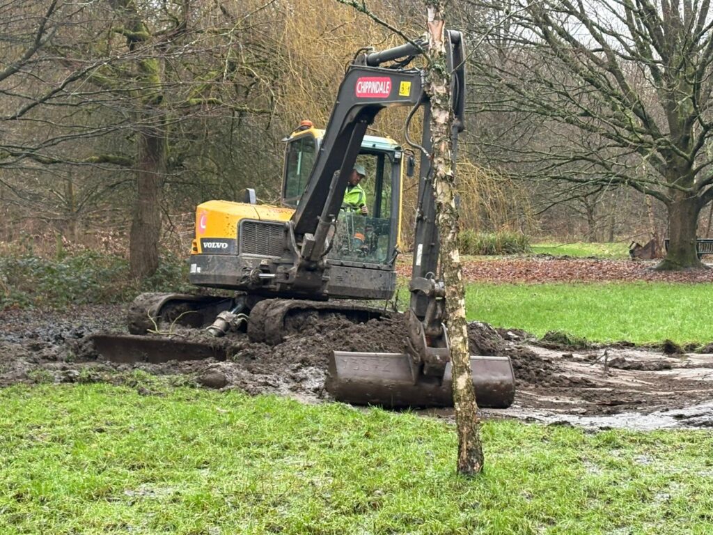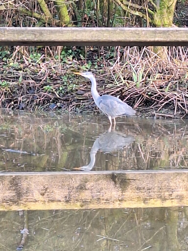 In mid January Lancashire Wildlife Trust did a week’s work managing the wildflower meadow and dipping pond in Fletcher Moss Park to provide improved wildlife habitats. They brought in machinery to dig ‘scrapes’, shallow pools with muddy margins that dry out in summer, and attract a range of specialised invertebrates that are a food source for waders and other birds. A young heron immediately arrived in search of amphibians, undeterred by our presence.